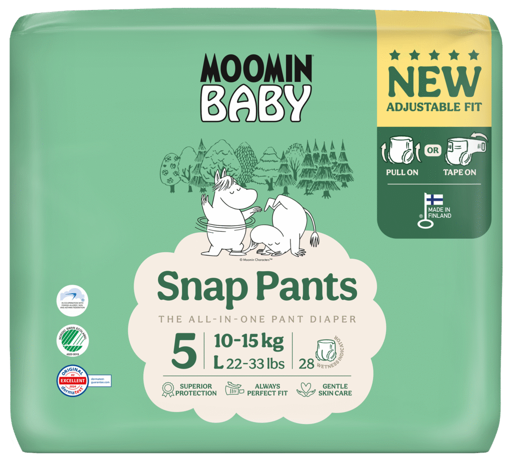 Moomin Baby diapers are made from Nordic FSC®-certified pulp using renewable solar energy and hydropower. Waste from production is recycled into energy.